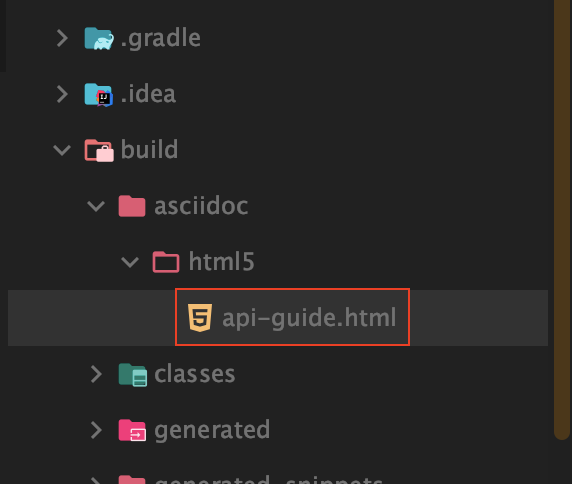 위 경로에 위치하고 있는 asciidoctor를 실행해주면 build > asciidoc > html5 경로에 api-guide.html 파일이 생성되는 것을 확인할 수 있습니다.