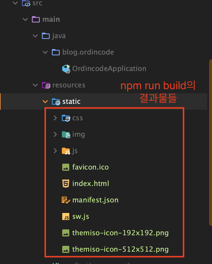 그러면 dist파일이 생길 텐데 spring프로젝트를 하나 만들고 dist안에 있는 파일들을 spring 프로젝트의 static에 넣어 줍니다.