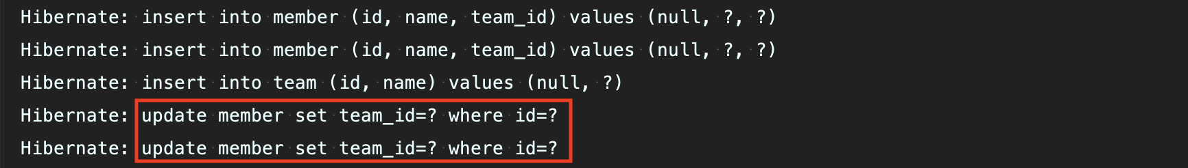 member에 팀을 셋팅해주는 2번의 update 쿼리가 추가로 발생하네요.