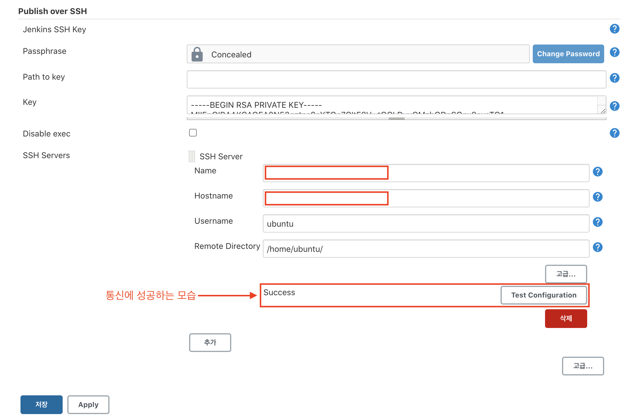 먼저 Publish over SSH 플러그인을 설치하고 jenkins관리 > 시스템 설정으로 들어가 Publish over SSH에 관한 몇 가지 설정을 해준 후 테스트를 해보니 통신에 성공하는 모습입니다. 파일을 전송할 수 있는 환경이 완성되었네요.
