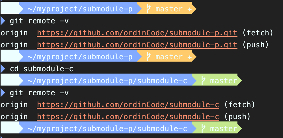 ex) git submodule add https://github.com/ordinCode/submodule-c.git