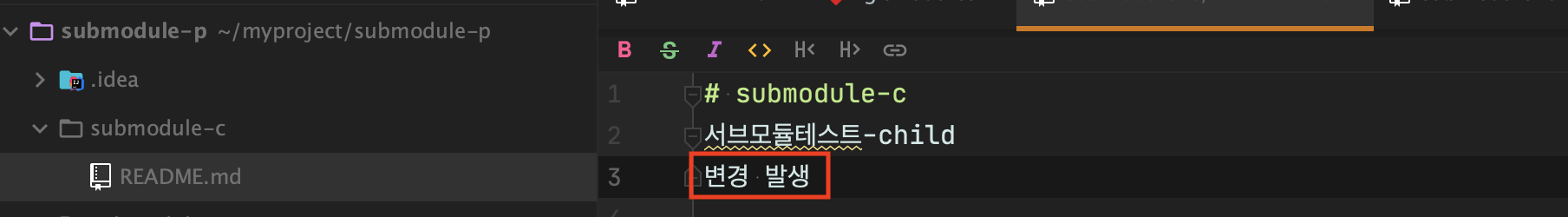현재 서브모듈에서 작업을 하고 commit을 상태라고 가정합니다. 아직 push는 하지 않았습니다.
